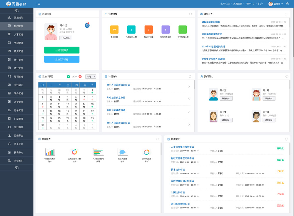 ● 我的崗位:即時調閱當前崗位職責;● 計劃待辦:本部門所有的計劃事項進度及當前需要辦理的事務信息;● 預警提醒:本部門所有的HR管理的異常情況提醒;● 申請審批:辦理本部門所有成員提交過來的申請審批單據;● 我的行事歷:萬年歷網格化顯示每天的關鍵工作事項;● 我的團隊:即時查詢本部門所有成員的個人信息,可在線溝通;● 常用報表:扁平化多維度圖形顯示本部門HR相關統計分析報表;● 通知公告:全公司發布的通知即時顯示。